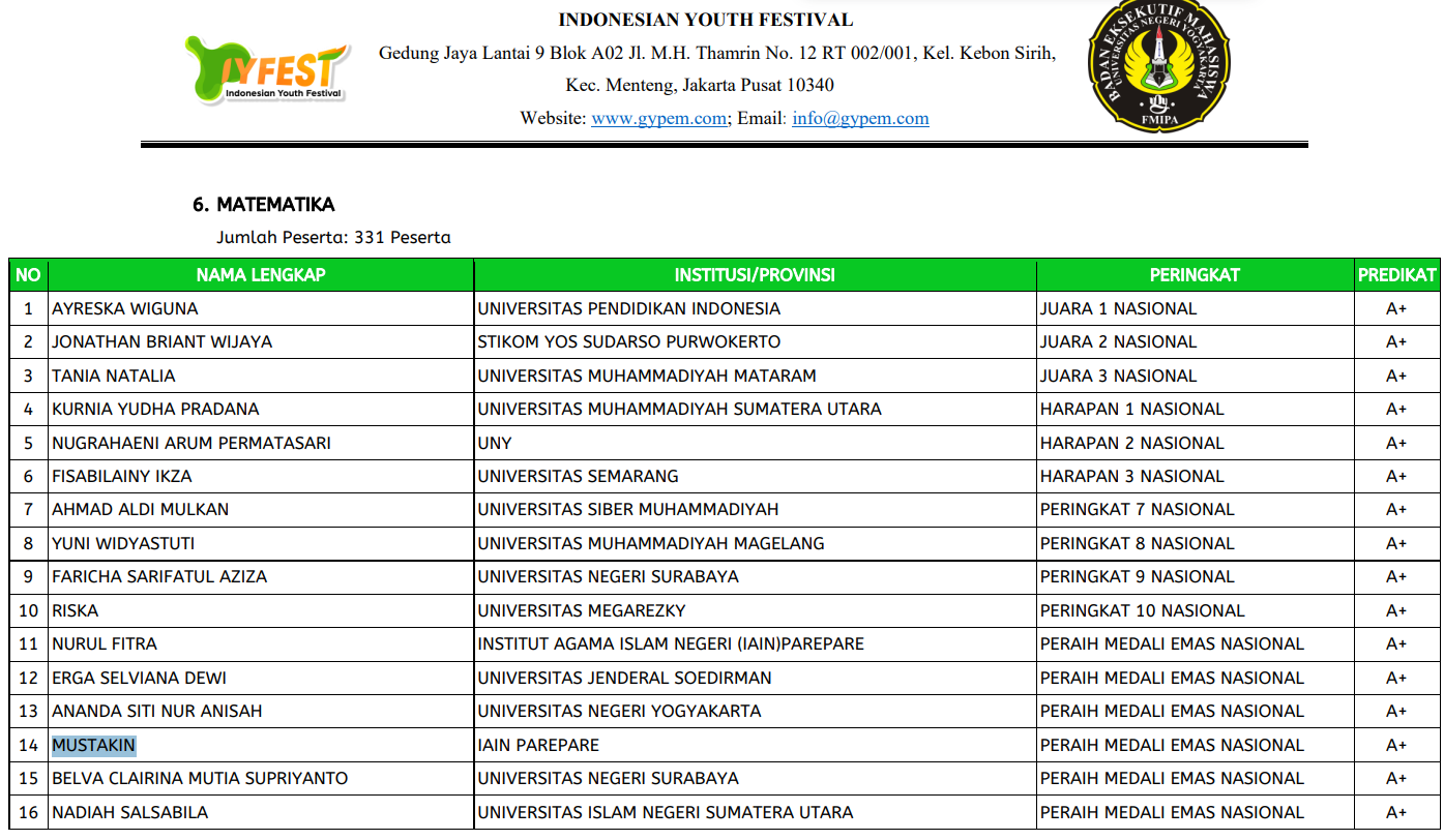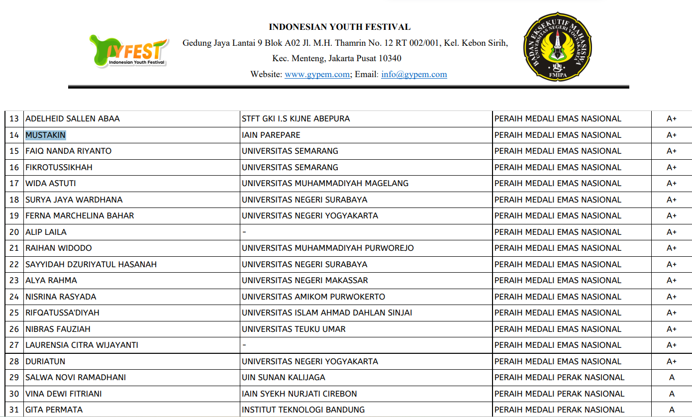 Fakultas Tarbiyah IAIN Parepare - Mustakin, mahasiswa Program Studi Pendidikan Agama Islam (PAI) IAIN Parepare, menorehkan prestasi membanggakan dengan meraih tujuh medali emas pada Ajang Sains Nasional Vol. 3 – IYFEST x BEM FMIPA Universitas Negeri Yogyakarta yang dilaksanakan pada 21–22 Februari 2026.